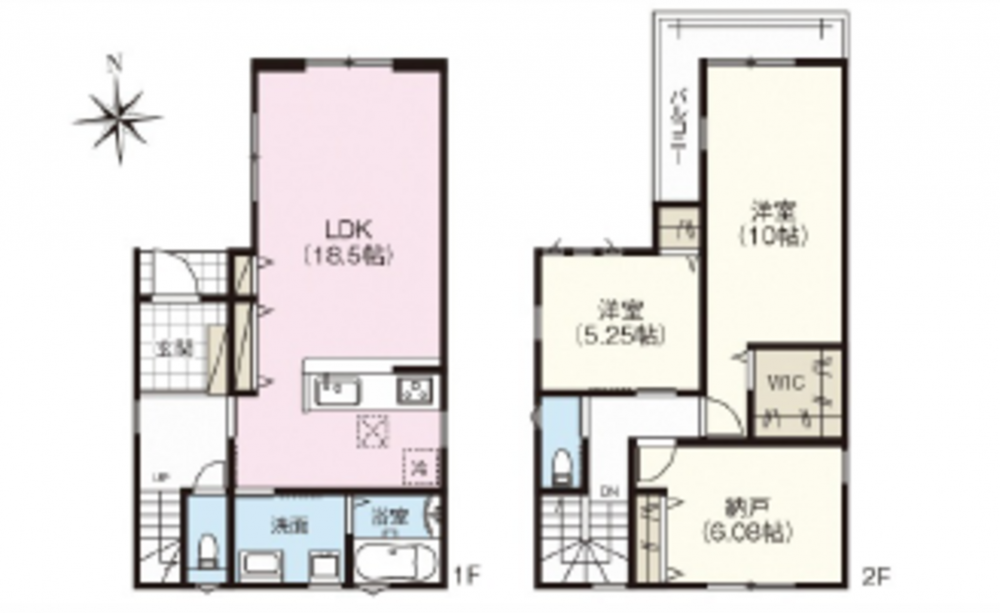 1F 18.5LDK 2F 10洋 5.25洋 6.08納戸 WIC トイレ