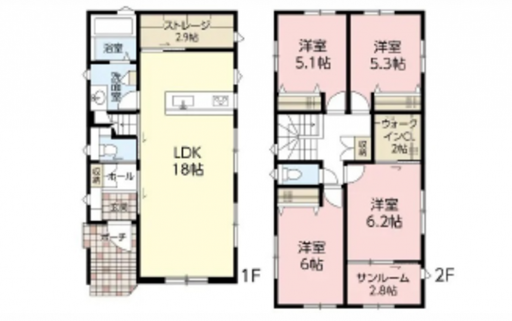 1F 18LDK 2.9ストレージ 2F 6.2洋 6洋 5.3洋 5.1洋 2WIC トイレ 2.8サンルーム