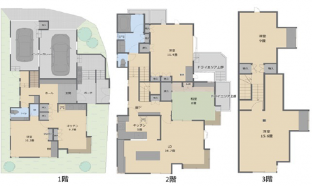 1F 9.7DK 10.2洋 車庫 2F 16.7LD 5K 11.4洋 8和 浴室 洗面 トイレ 3F 15.6洋 9洋