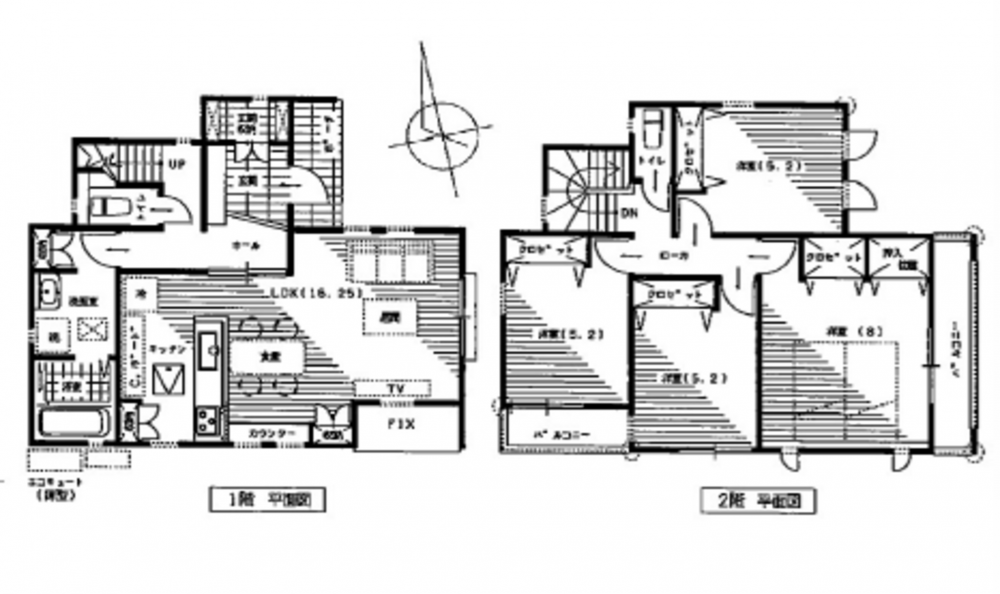 1F 16.25LDK 玄関収納 2F 8洋 5.2洋 5.2洋 5.2洋 トイレ