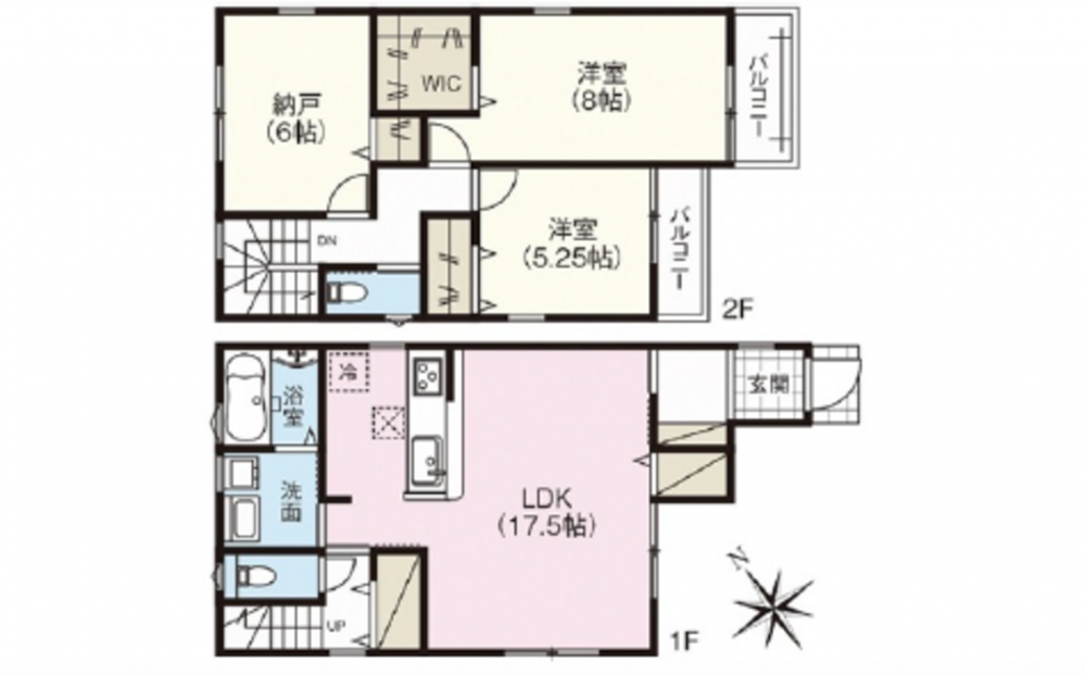 1F 17.5LDK 2F 8洋 5.25洋 6納戸 WIC トイレ
