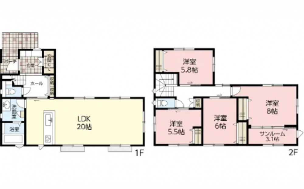 1F 20LDK 玄関収納 2F 8洋 6洋 5.8洋 5.5洋 3.1サンルーム トイレ
