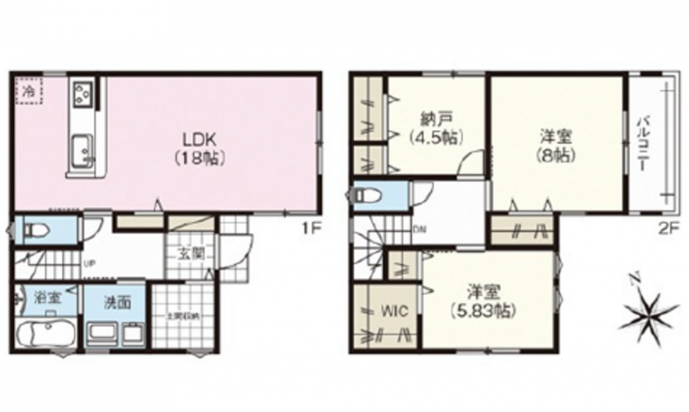 1F 18LDK 土間収納 2F 8洋 5.83洋 4.5納戸 WIC トイレ